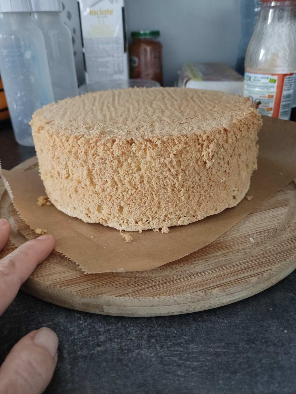 Przygotowa艂am go w wersji bez skrobi ziemniaczanej (tylko na m膮ce pszennej), dzi臋ki temu jest bardziej zwarty i mi臋sisty. Bardzo dobrze nadaje si臋 do przek艂adania ci臋偶szymi kremami.