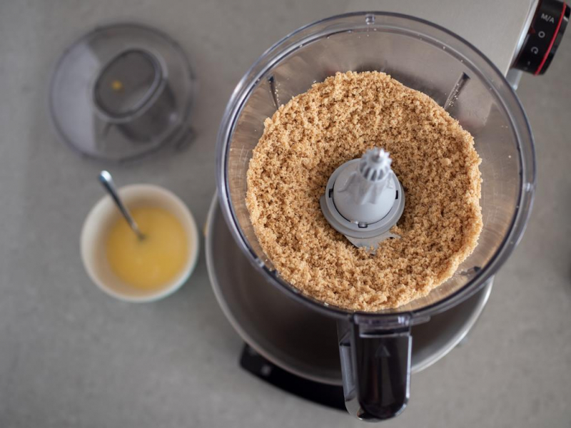 Masło rozpuść w mikrofali lub w rondelku i przełóż do malaksera razem z kruchymi ciasteczkami. Miksuj pulsacyjnie do otrzymania masy przypominającej mokry piasek.
