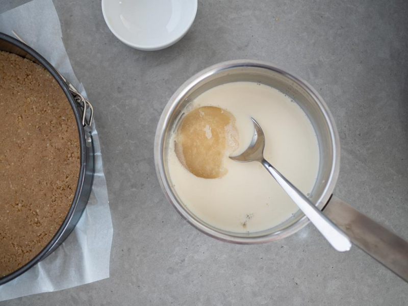 Pozostałą śmietankę zagotuj. Zdejmij z palnika i dodaj żelatynę. Wymieszaj do całkowitego rozpuszczenia.