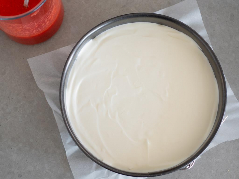 Na schłodzony sernik wylej galaretkę truskawkową i ponownie odstaw do lodówki.
