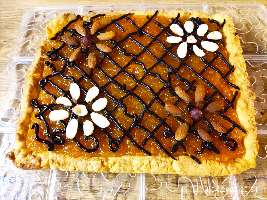 Do pomara艅czy dodaj posiekane migda艂y i jeszcze ciep艂膮 konfitur臋 rozsmaruj na upieczonym kruchym spodzie.