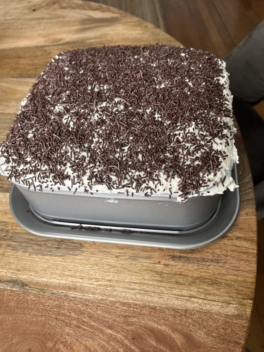 Przed podaniem ciasto udekoruj czekoladową posypką i różyczkami z opłatka.