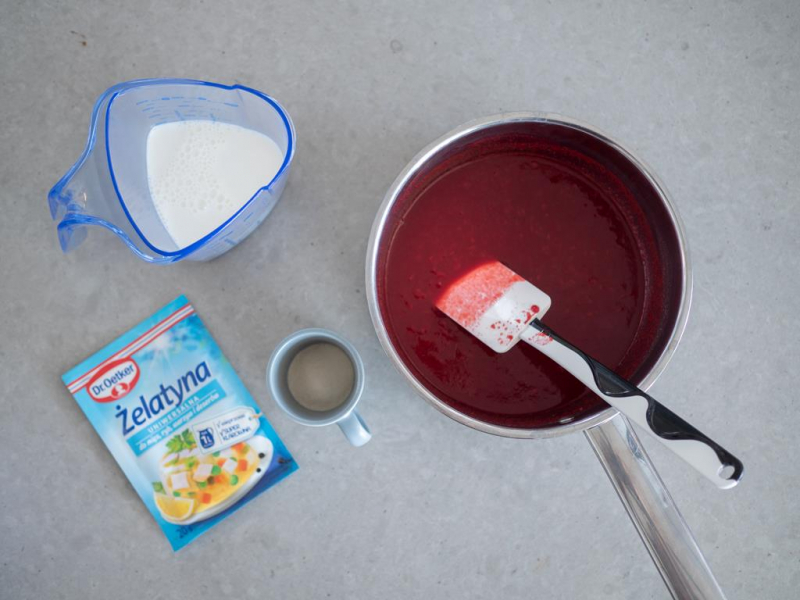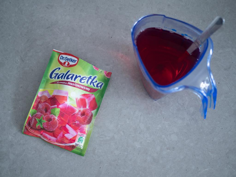 W 500 ml wrzącej wody rozpuśc galaretkę malinową. Odstaw do wystudzenia.