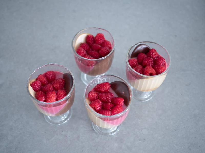 Żelującą już galaretką zalej przecięte na pół maliny i odstaw do lodówki.