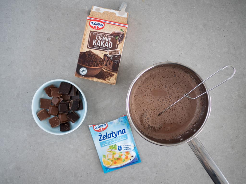 Do gorącej śmietanki dodaj kakao i zalej nią czekoladę i żelatynę. Dokładnie wymieszaj do rozpuszczenia się czekolady.
