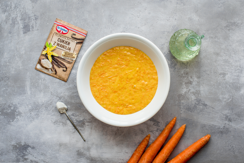 Ciągle ubijając, wlej cienką strużką olej, a później dodaj marchewkę.