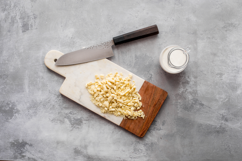 Czekoladę posiekaj na małe kawałki, dodaj 50 ml śmietanki i podgrzej na niewielkiej mocy do rozpuszczenia się czekolady. Odstaw do przestudzenia.