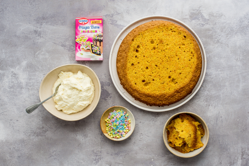 Wierzch ciasta udekorowany jest okruszkami z odciętego wierzchu i pastelową, wiosenną posypką z serii Magia Barw. Idealna kompozycja na przyjęcie urodzinowe czy weekendowe spotkanie w gronie przyjaciół.