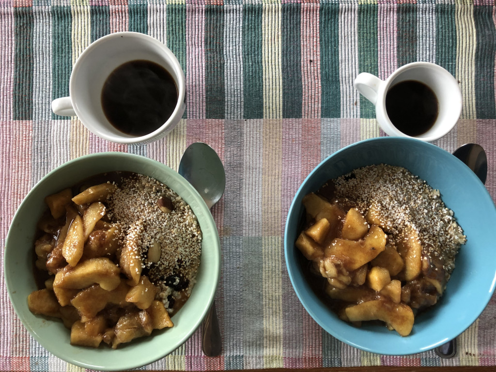 Olej kokosowy rozgrzej na patelni. Dodaj do niego syrop klonowy i cynamon.