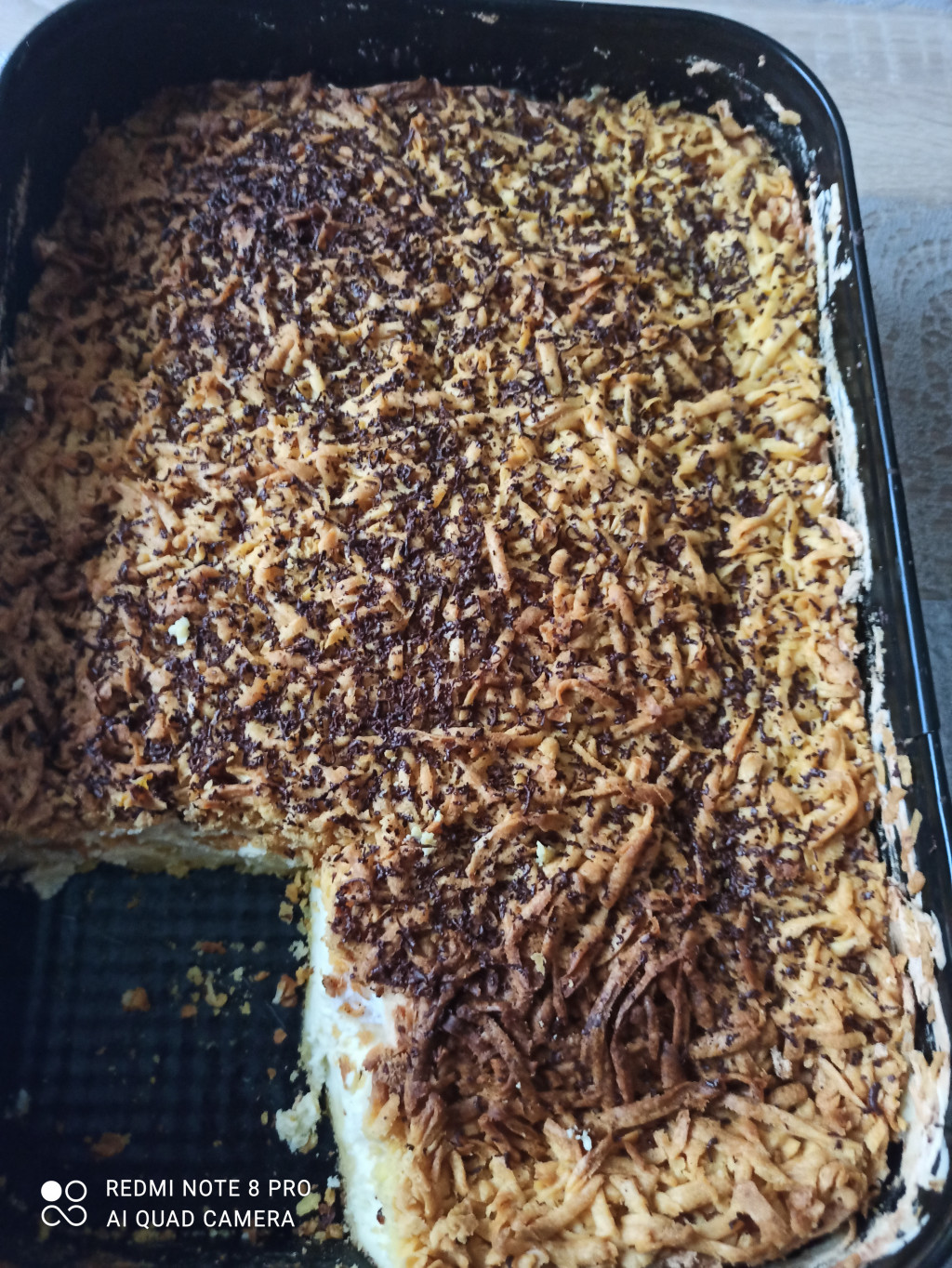 Na przygotowaną blachę zetrzyj równomiernie (na tarce o grubych oczkach) jedną część schłodzonego ciasta.
