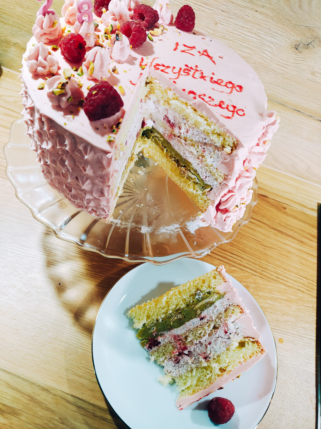 Nałóż drugą warstwę kremu, dokładnie go wyrównując. Pozstałą cześć przełóż do worka i udekoruj ozdobną tylką. Poukładaj kilka malin i posyp posiekanymi pistacjami.